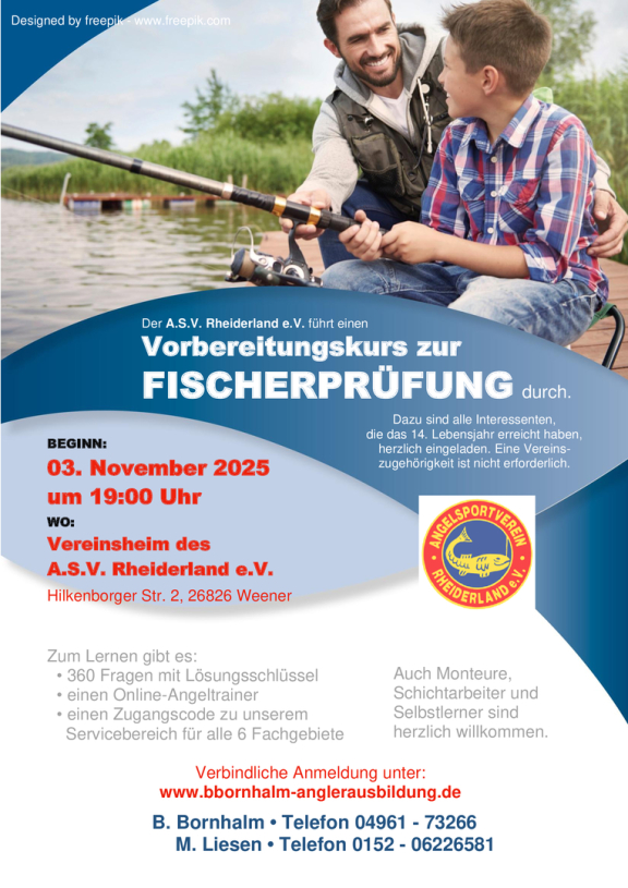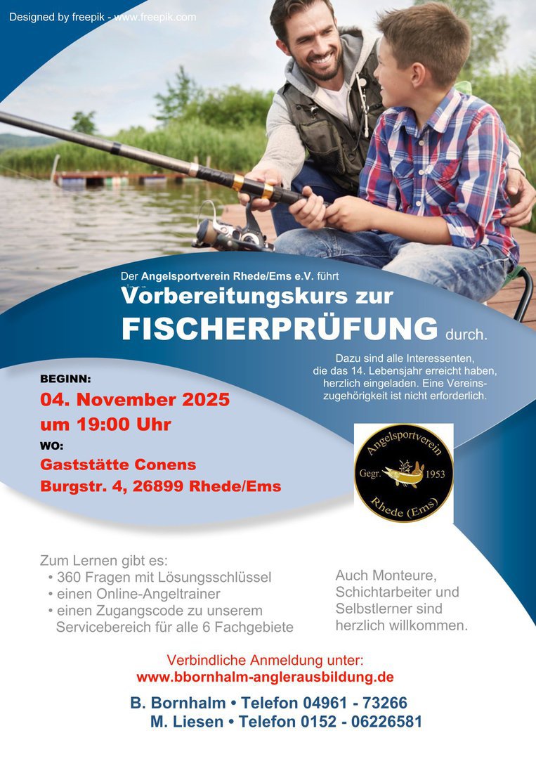 Der A.S.V. Rhede e.V. führte vom 04. November 2024 bis zum 28. November 2024 einen Vorbereitungskurs auf die Fischerprüfung durch. Die Prüfung fand am 03. Dezember statt. Alle 27 Prüflinge konnten erfolgreich die Fischerprüfung ablegen. Wir gratulieren ganz herzlich.