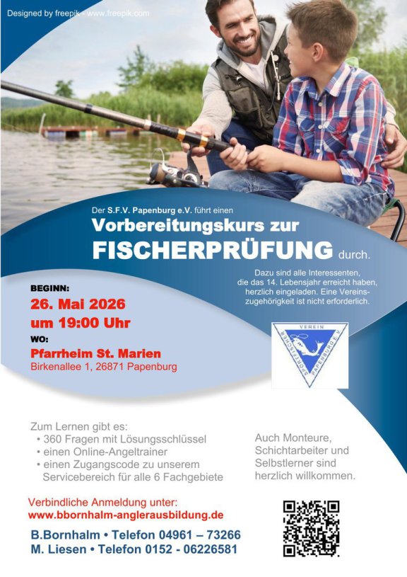 Der F.V. Rhauderfehn e.V. führte vom 10. Februar 2026 bis zum 06. März 2026 einen Vorbereitungskurs auf die Fischerprüfung durch. Die Prüfung fand am 10. März im Rathaussaal in Rhaudefehn statt. 24 Prüflinge konnten erfolgreich die Fischerprüfung ablegen. Wir gratulieren ganz herzlich.